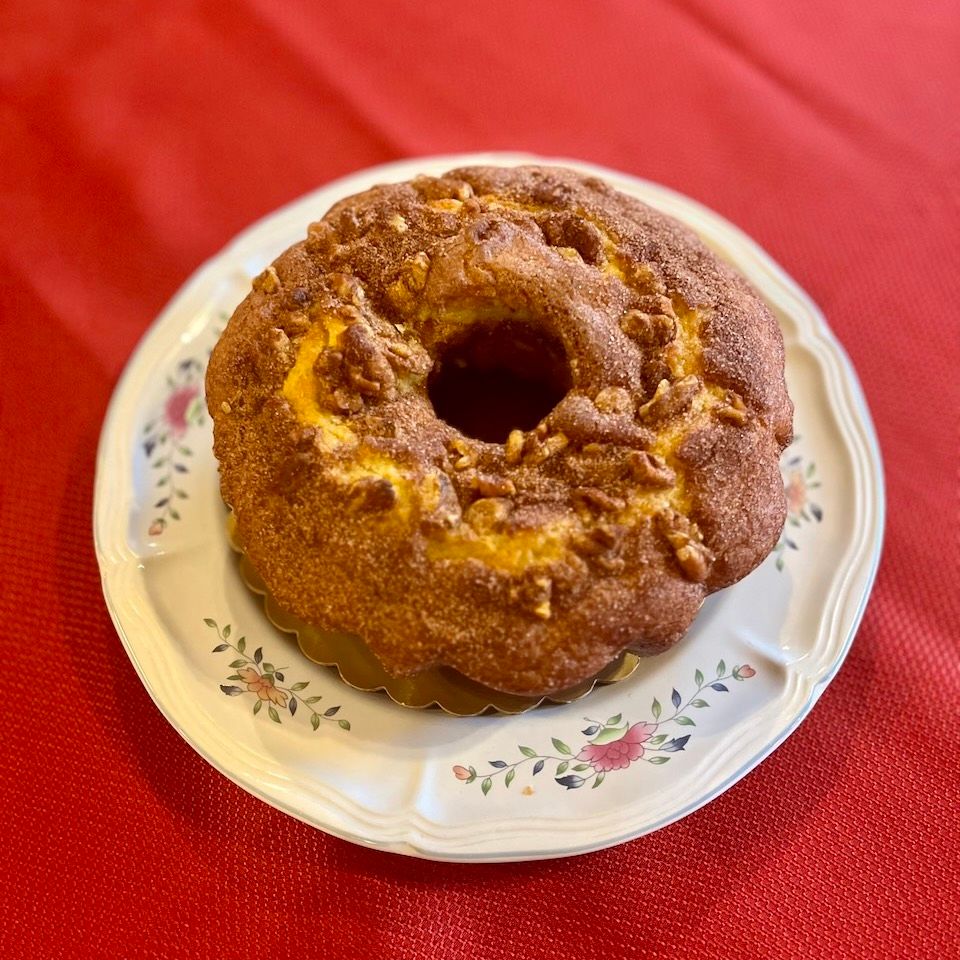 Ingredients: Sugar, bleached wheat flour, sour cream (cultured pasteurized light cream, nonfat milk, and enzymes), soybean oil, eggs, walnuts, water, modified food starch, cinnamon, buttermilk solids, leavening (baking soda, sodium acid pyrophosphate, monocalcium phosphate), whey protein (milk), natural flavor (milk), mono and diglycerides, sea salt, xanthan gum, enzyme, turmeric added for color.